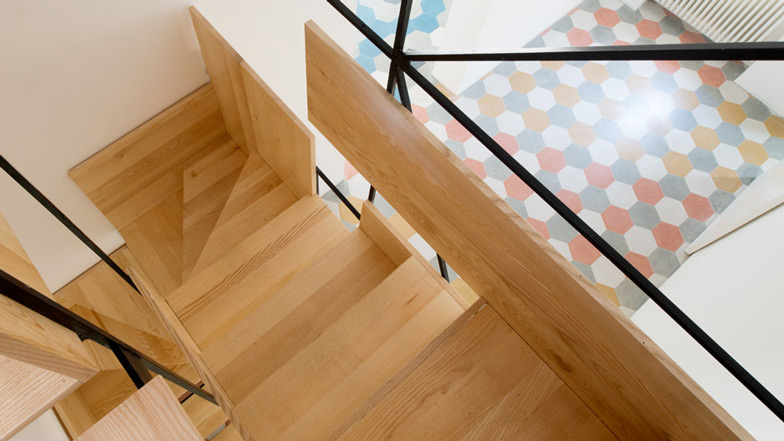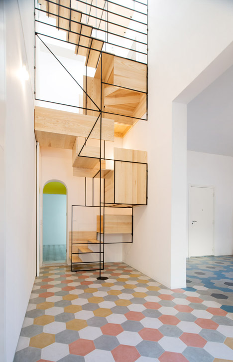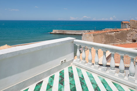 how a staircase can become a sculpture that moves through a house until the top terrace with this magnificent view of the tyrrhenian sea. a great use of colorful tiles.