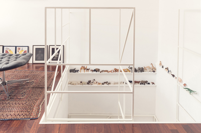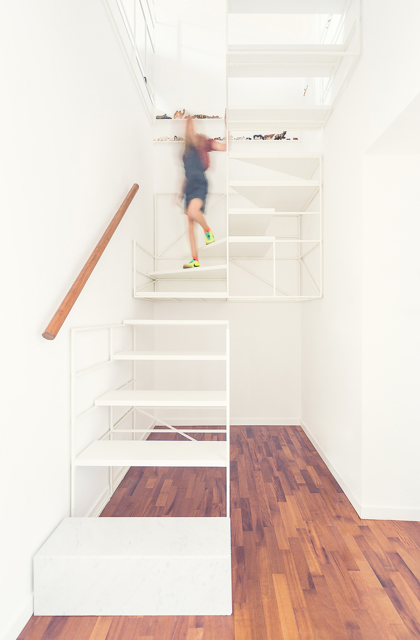 já há uns tempos publiquei um projecto deste arquitecto, pois acredito que numa casa a escada pode ser um elemento muito interessante e escultural. de design delicado e simples esta estrutura parece que mal toca nas paredes. ao separar a mesma em dois elementos, intensifica ainda mais a impressão que flutua no espaço.