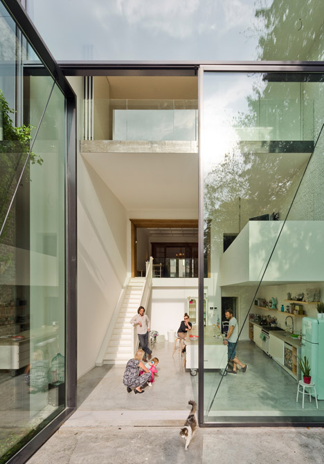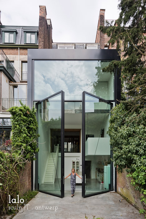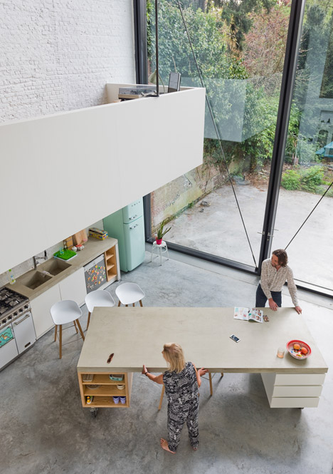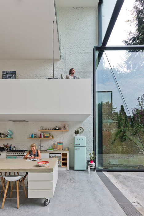 esta habitação unifamiliar é a chamada típica casa belga, estreita, funda e com jardim atrás. fachadas pequenas, apenas duas, frontal e posterior, e um interior pronto a ser desventrado para que a pouca luz que entra, entre por ela toda como um só. o raciocínio está exactamente no aproveitamento dessa luz, cores claras e modos de alterar espaços apenas num click. aqui o click é mesmo a espectacular adaptação da “mesa de jantar”/”banca de cozinha”.