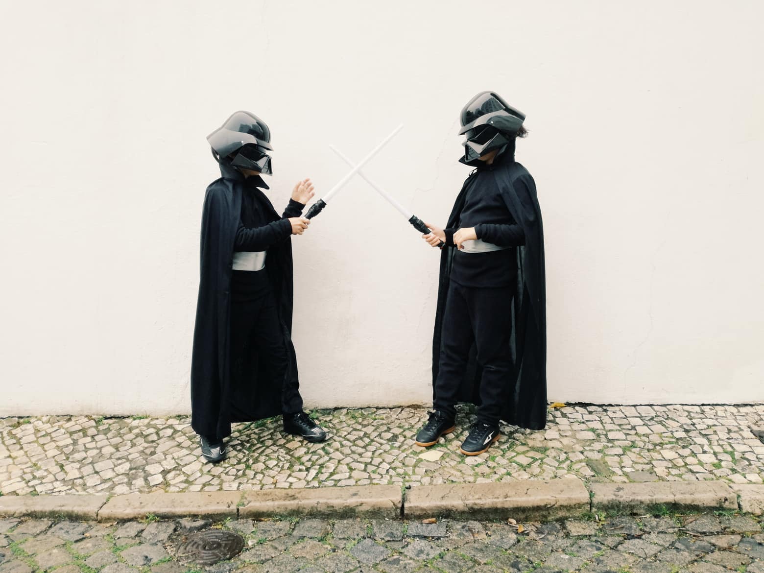 Os manso estão há anos em modo Star Wars, sabem tudo mas não sabem muito. Só falam disso e o Canaval tem sido bastante previsível. Este ano decidi não gastar dinheiro em fatos já feitos porque custam um balúrdio e deixam de servir logo, eles crescem com o sol e isto não tarda não dá para tamanhos de criança. Comprei tudo no Mega Chinês de Alfragide, com um fato de treino de base que dá imenso jeito para a ginástica, capa de drácula e máscara/capacete de um soldado parecido com o Darth Vader… bora la!
