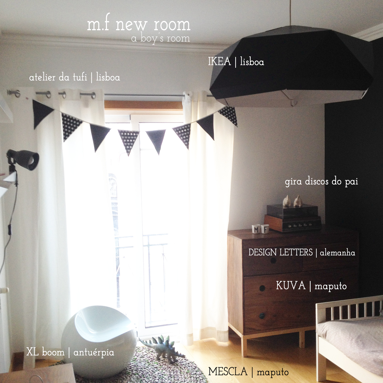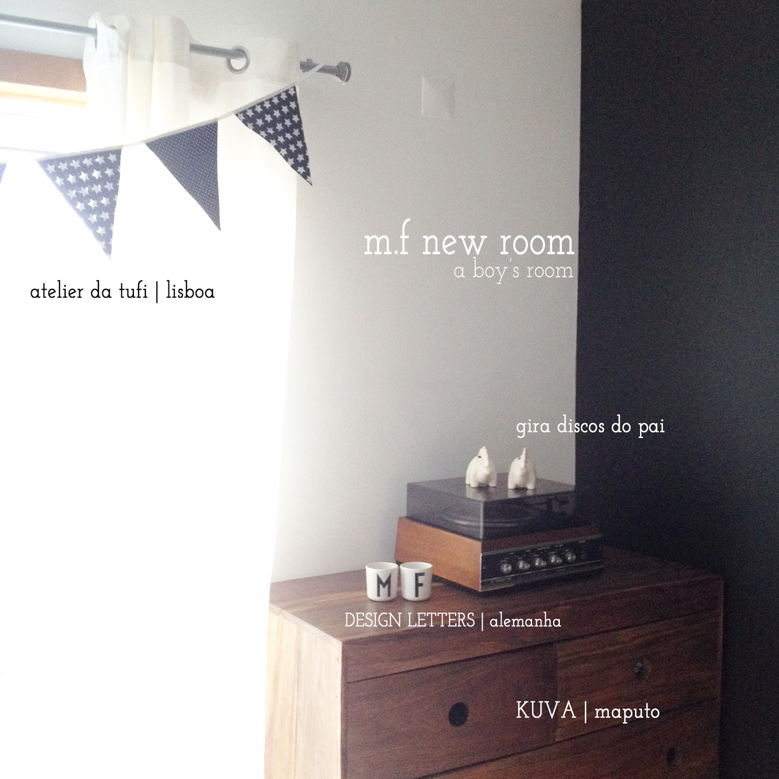 como lhes digo, neste quarto cabe o mundo… o nosso… o deles. quase tudo, claramente não as coisas do ikea, vêm dos nossos lugares, onde vivemos, onde sonhámos e onde construimos esta família. eles sabem de onde chegou tudo, até o tapete que mandámos fazer quando soube que estava grávida para que pudéssemos ter um tapete moçambicano no meio da nossa sala onde sonhava que eles brincassem… agora é deles. o gira-discos do pai está ali a modos que a pedir que o usem mas não sem a nossa autorização. os copos de água, mandei vir para eles e para mim, porque somos fanáticos por letras. o móvel, esse foi desenhado pelo pai e feito à mão pelo Jaime em maputo e à medida que cresciam era alterado para ser mais prático. cada um de nós tem uma peça preferida, as minhas são sem dúvida os copinhos, mas ainda há tanto para vir!