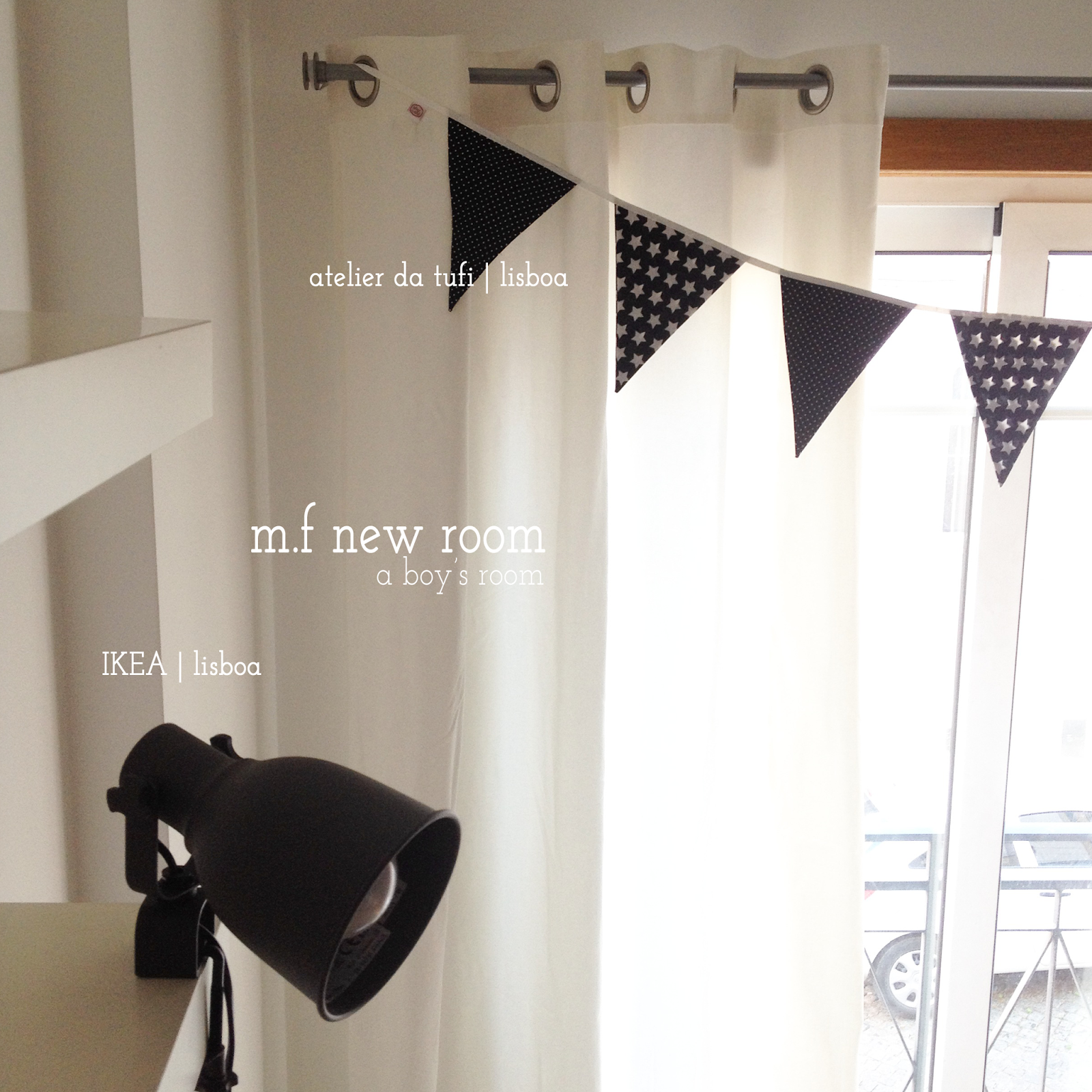 o principal: a parede maior! preta! feito isto surgiram outras mil dúvidas, como: alteramos tecidos? tapetes? candeeiros? …aqui nem ganhei eu nem ele, foi óbvio, SIM mudamos! ao pintar uma parede enorme de preto é preciso assumi-lo e eu quis mesmo que o preto fosse predominante. começamos pela parede, coloquei cortinas novas brancas com um apontamento giríssimo da bandeirola do atelier da tufi, com apenas dois tecidos para não ficar um caos. os candeeiros, pretos e giros do ikea completam perfeitamente o tecto como as prateleiras brancas e enormes que já lá estavam. a partir daqui foi pensar nos acessórios… não antes de me meter a fazer a minha última loucura… mas isso fica para depois!!