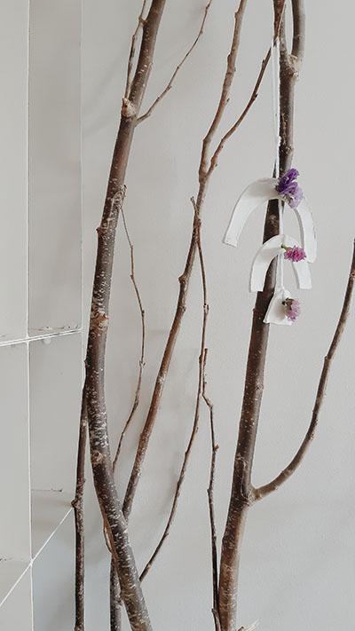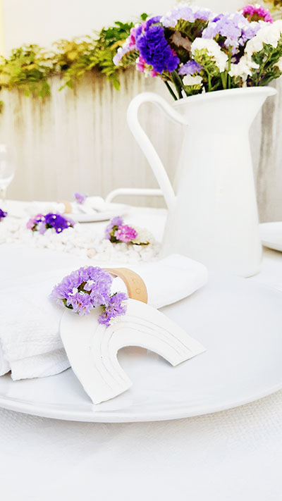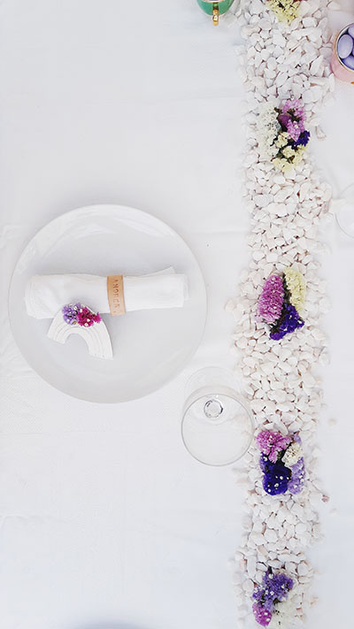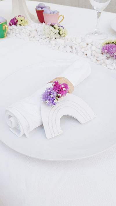 Usei as flores para ir criando apontamentos de cor, um jarro com flores, o foral rodeado de flores, e os arco íris com cor. Num mesa cheia de brancos os tons das flores deram-lhe cor.