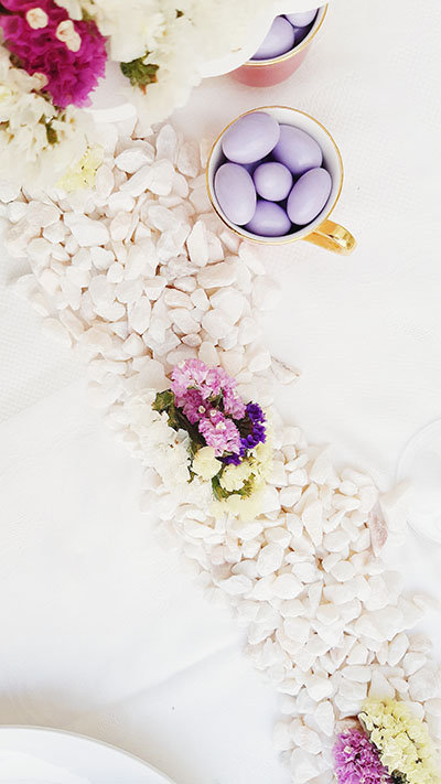 Lembrei-me da gravilha que tenho sempre à mão, branca, em dois tamanhos diferentes, e que podia usar num centro, ao comprido, baixo porque a mesa ia ser apenas para 4 pessoas.