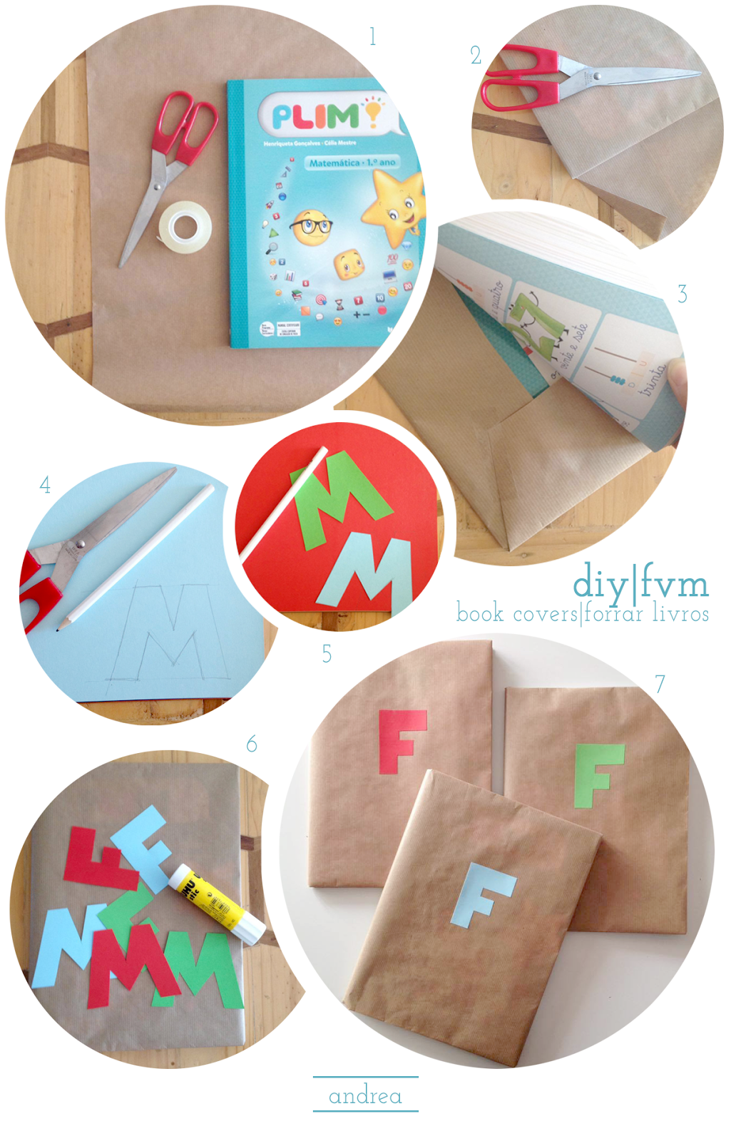 Para os meus filhos, como têm apenas três livros, em três cores diferentes e ainda não sabem ler tudo, em vez de escrever na capa que livro é, fiz-lhes ver que os livros tinham cores e que cada cor corresponde a uma displicina com exercícios diferentes, etc. Para os identificar, perguntei como queriam fazer e como lá por casa damos muita importância ás iniciais disseram logo que queriam as letras nos livros. Assim, bastou comprar cartolinas das cores dos livros e a mãe desenhou as letras, eles cortaram e colaram. Primeiro estranharam porque achavam que eu ia forrar com papeis com bonecos e super-heróis, mas eu expliquei que o melhor era serem diferentes dos dos outros meninos para ser fácil perceberem quais o deles, claro, agora acham giríssimo e perguntam se não podem forrar o caderno preto, mas esse tem mesmo que ficar preto para todos. Acho óptimo, porque percebo que eles gostem, mas odeio cadernos todos cheios de desenhos.