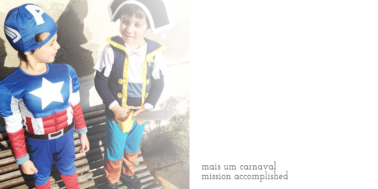 a semana teve boas surpresas e mais um carnaval. missão quase impossível de encontrar as máscaras que eles querem mesmo sem que falte um único detalhe, mais um ano em que pedi emprestado pois não entendo alguns preços de fatos… o abuso. claro, fica sempre a faltar qualquer coisa, não fazia ideia que o capitão américa tinha um escudo nem que o jake tem uma faixa na testa e não um chapéu de pirata, mas olha, é a vida! e lá foram na mesma…