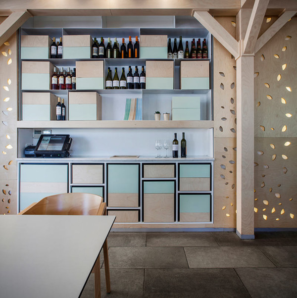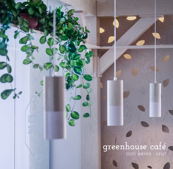 this project has a a principal inspiration the greenhouses in Tel Aviv. they wanted to incorporate plants as part of the design throughout the whole café, using birch wood for a natural effect as well as cut out leaves.