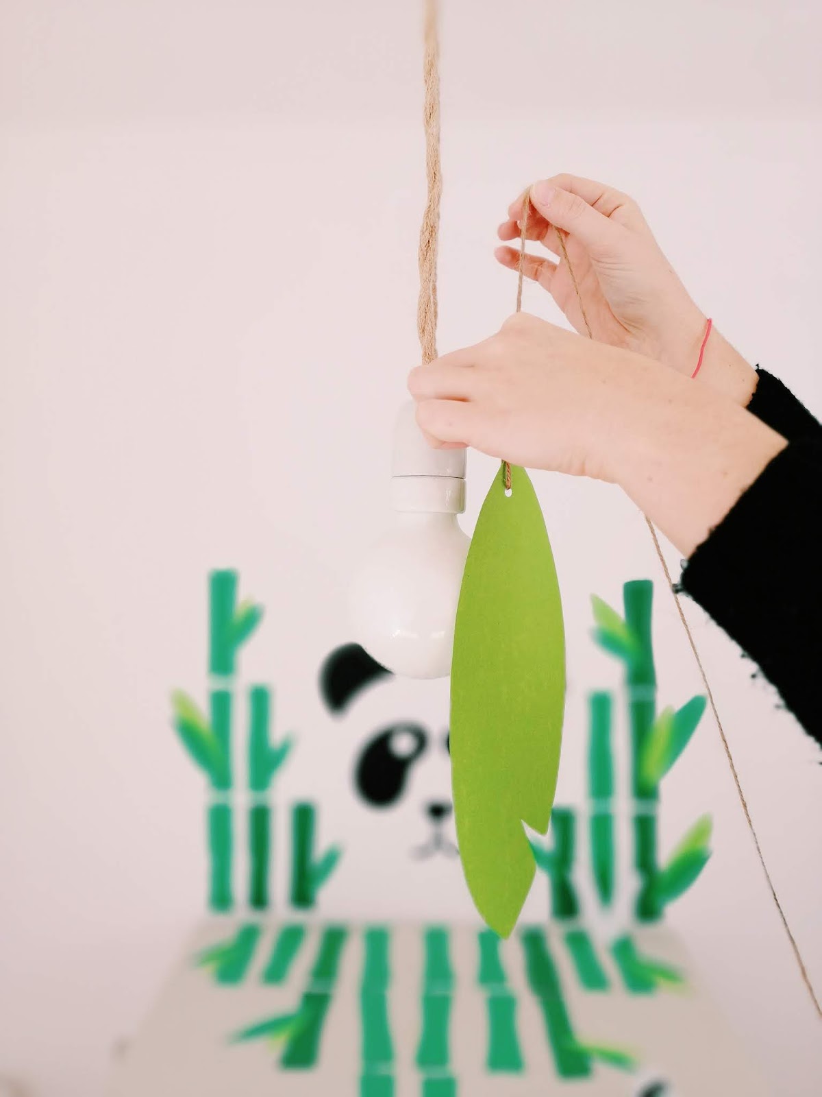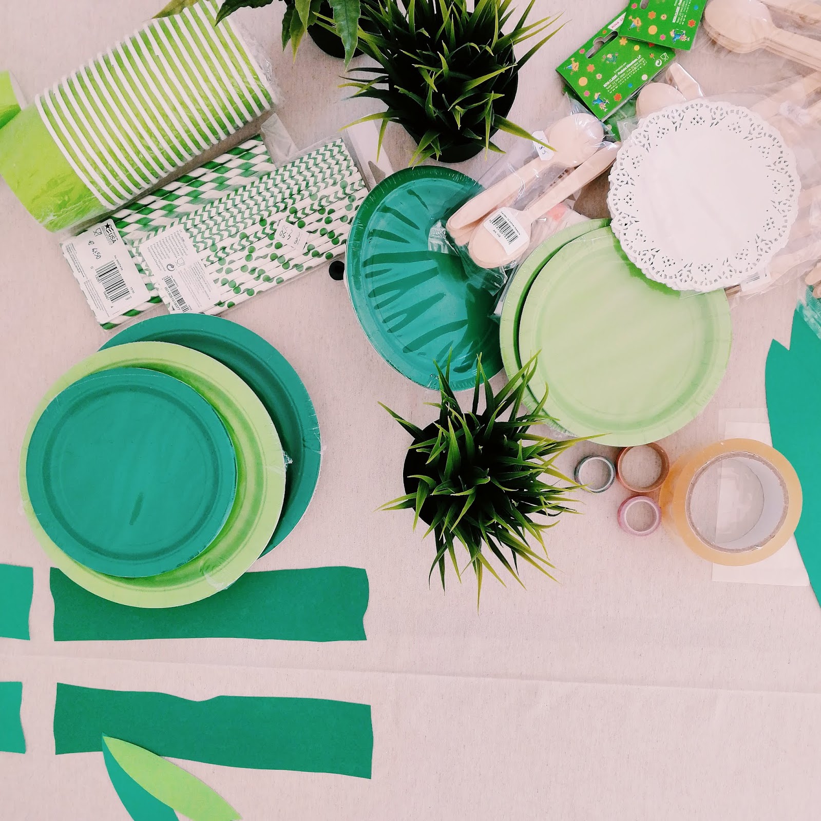 Adaptar toda a mesa ao cenário que se quer criar, neste caso fiz a continuação do mural para a mesa, e como se trata de uma mesa de 3m não valia a pena enchê-la toda de comida, 1/3 dela foi ocupado pela tal floresta de bambu. Alguns adereços como os potes para as pipocas arranjei nos mesmo tons do bambu tal como os copos. Juntei loiça e bases entre os verdes, brancos, pretos e de madeira para lhe dar um ar mais natural. Pela mesa espalhamos folhas mini e mini pompons pretos… que deu mote a muita galhofa aos miúdos!