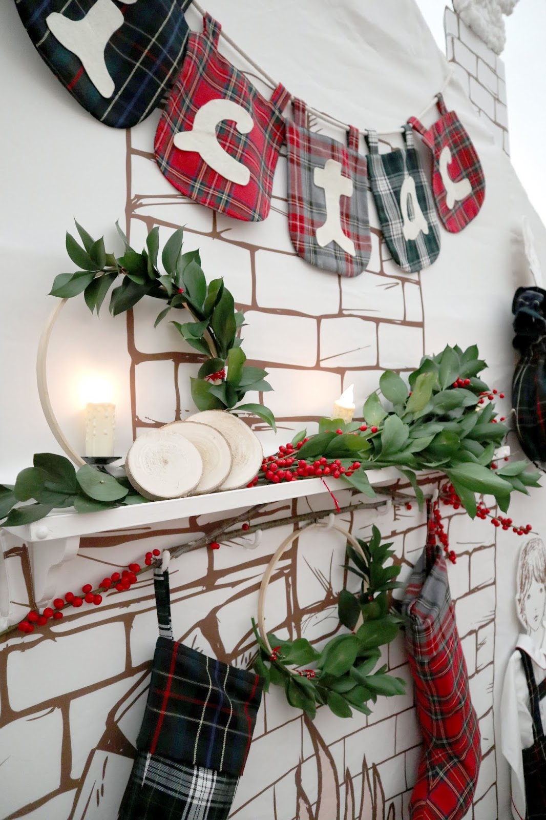 Recriámos o ambiente natalício à volta da lareira, decorada com as típicas meias de natal prontas a receber presentes, folhagens e bagas encarnadas para dar um toque natural, velas e coroas de Natal.