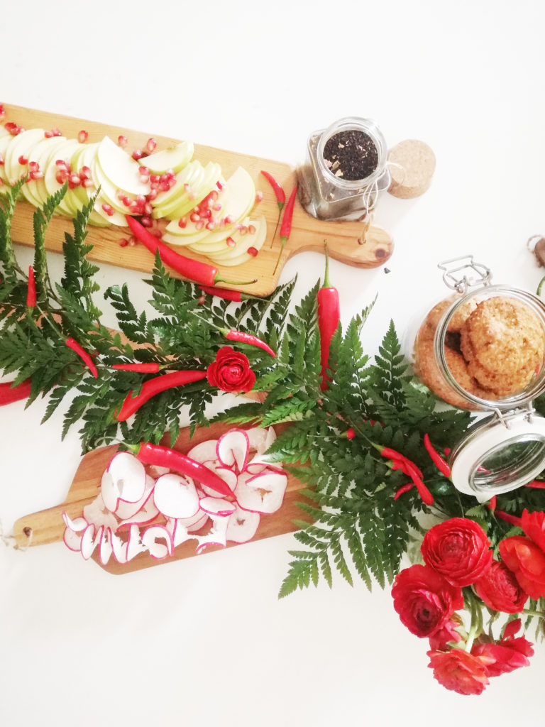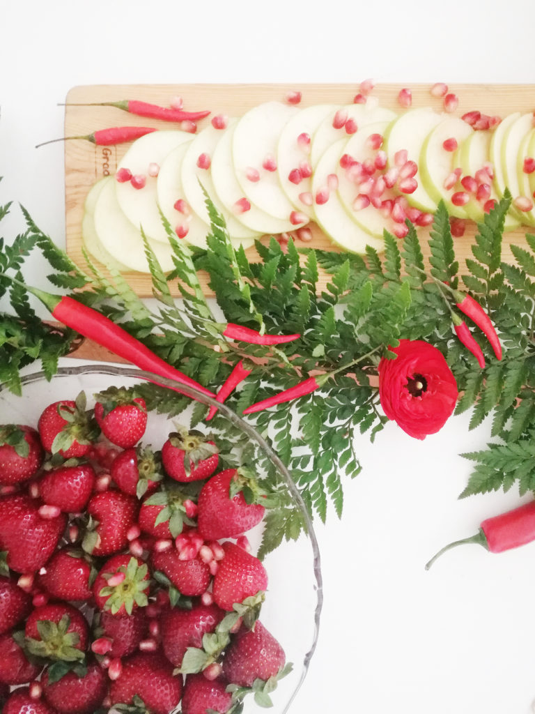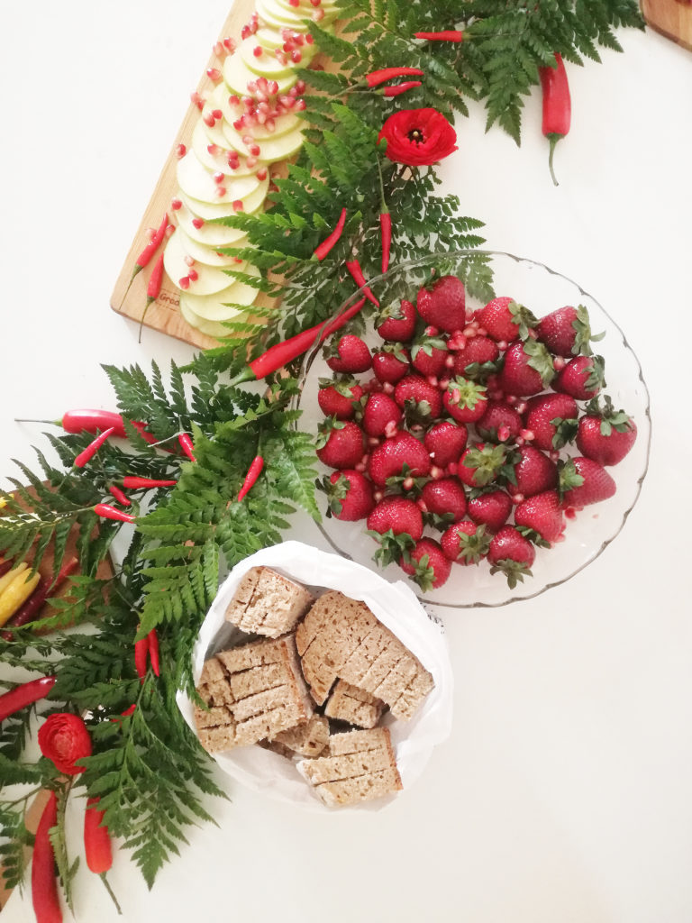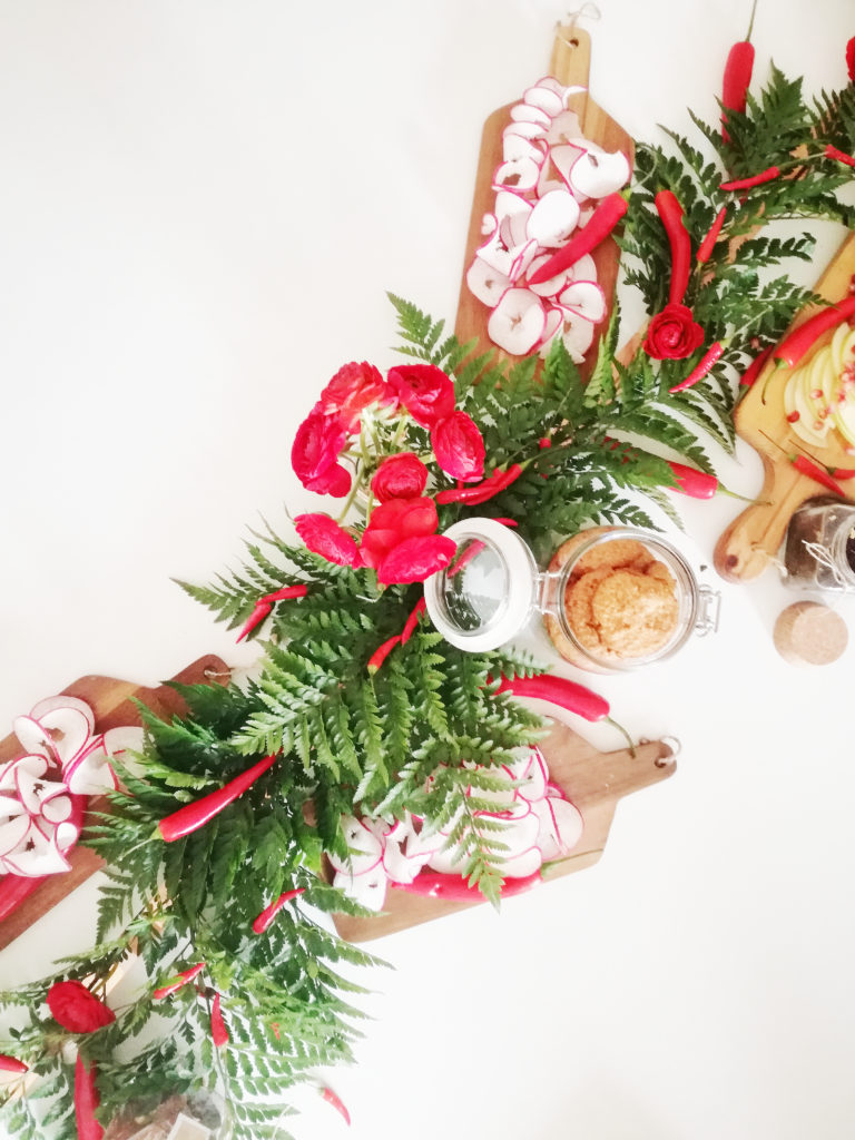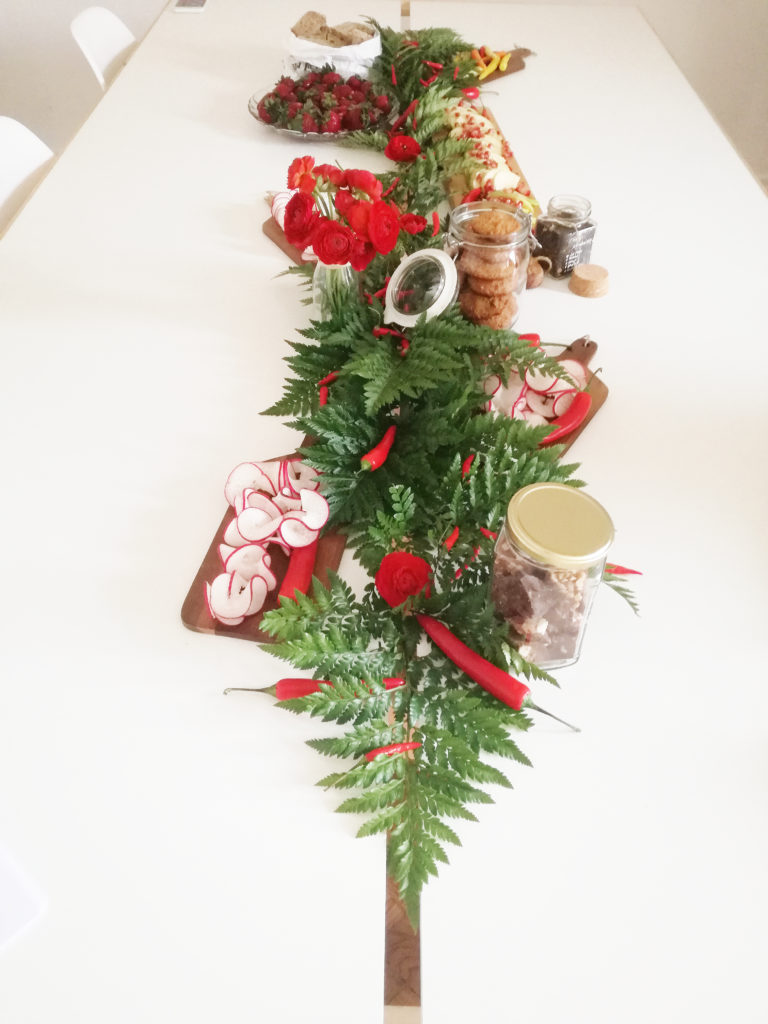 Catering fornecido por Maria Granel e It’s Up to you . com uma mesa, minha, linda decorada para o tema cheia de encarnados, verdes e sabores mais picantes!