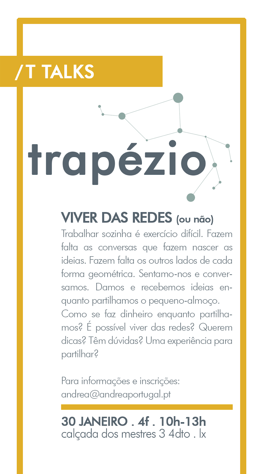 tra.pé.zi.o . #Ttalks | inscrições e info: andrea@andreaportugal.pt